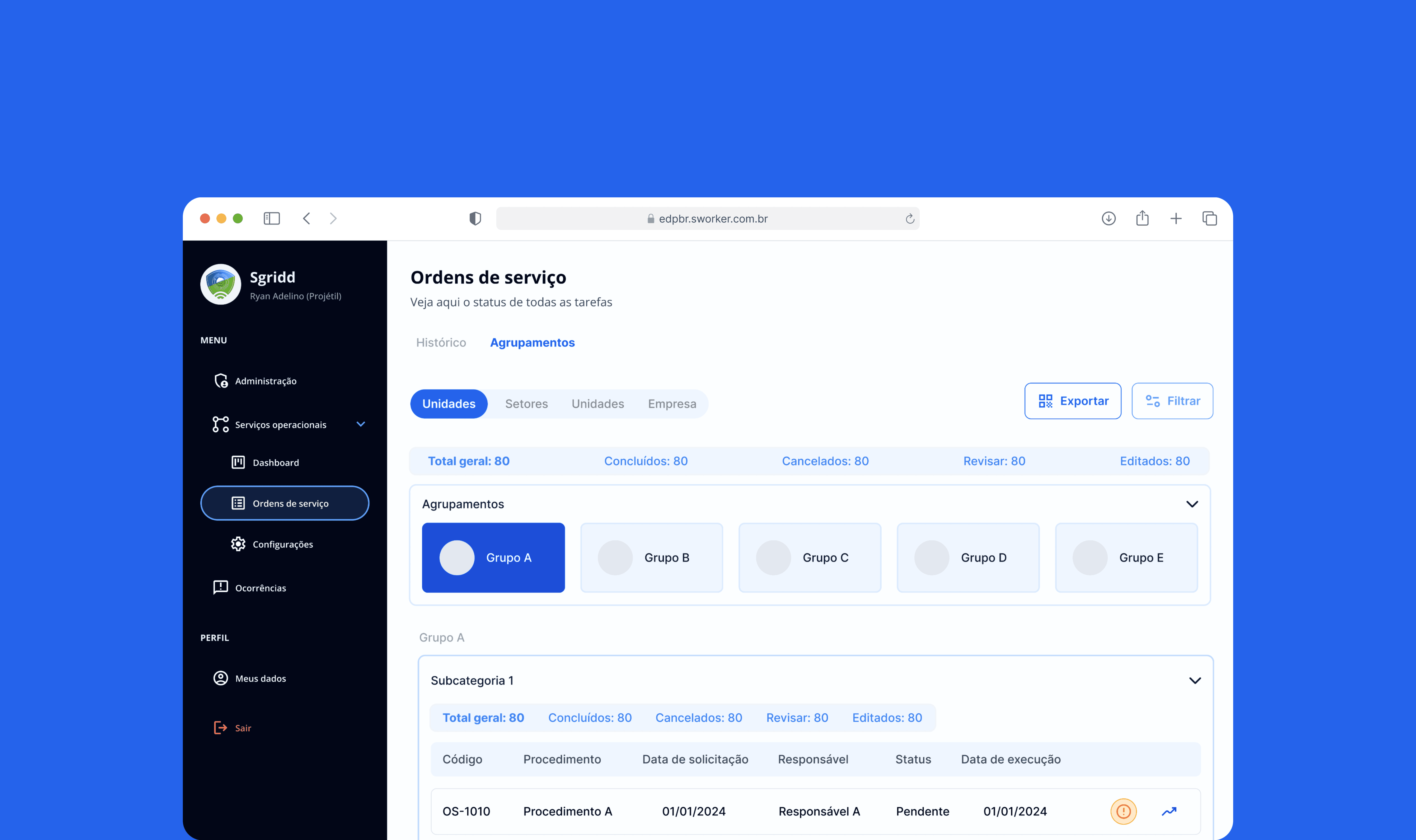 O Sworker é um produto da Sgridd, uma empresa com o selo DNA USP, especializada em transformação digital e desenvolvimento sustentável. E apresentamos o design de uma plataforma web capaz de cadastrar além dos processos, os colaborados da empresa, os equipamentos e todas as atividades que poderão ser registradas na plataforma.
