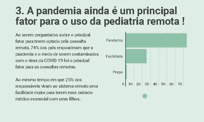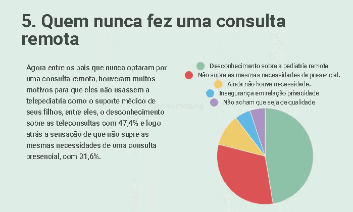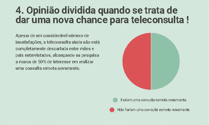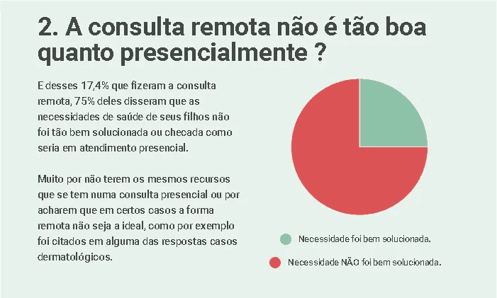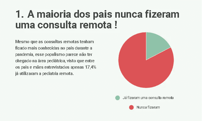 Diante dos resultados da pesquisa, concluímos que ainda há bastante desconfiança em relação ao uso da telemedicina com filhos, tanto pelo desconhecimento acerca do método remoto quanto pela impressão de que a telepediatria não seja tão boa quanto uma consulta presencial, apesar de sua praticidade em não precisar sair de casa.