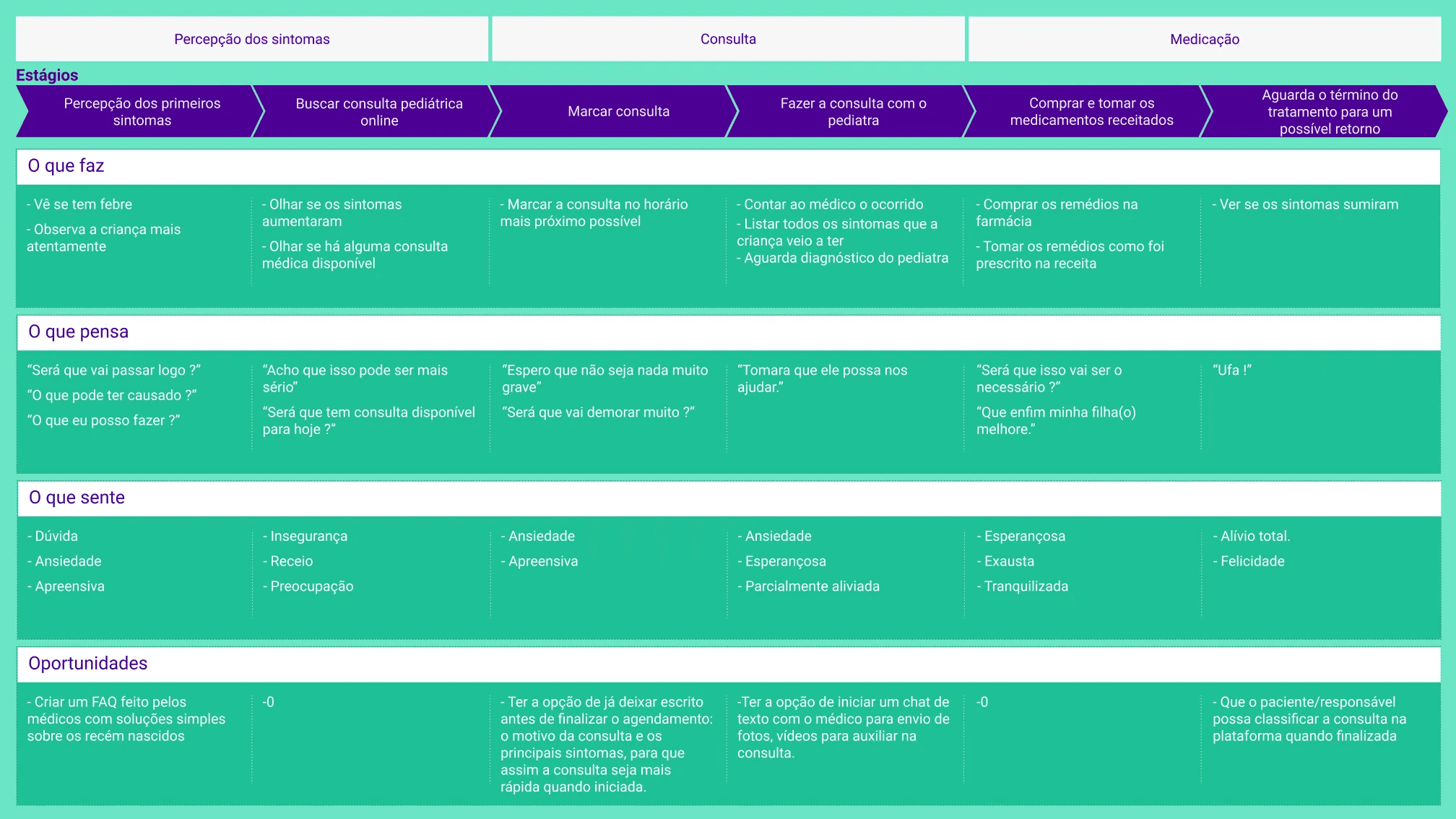 Em complemento à persona, realizei o mapeamento de uma possível jornada do usuário para identificar possíveis pontos de maior preocupação/angústia que o usuário possa ter durante uma consulta médica, além de identificar pontos em que o nosso produto pode atuar com intuito de melhora.