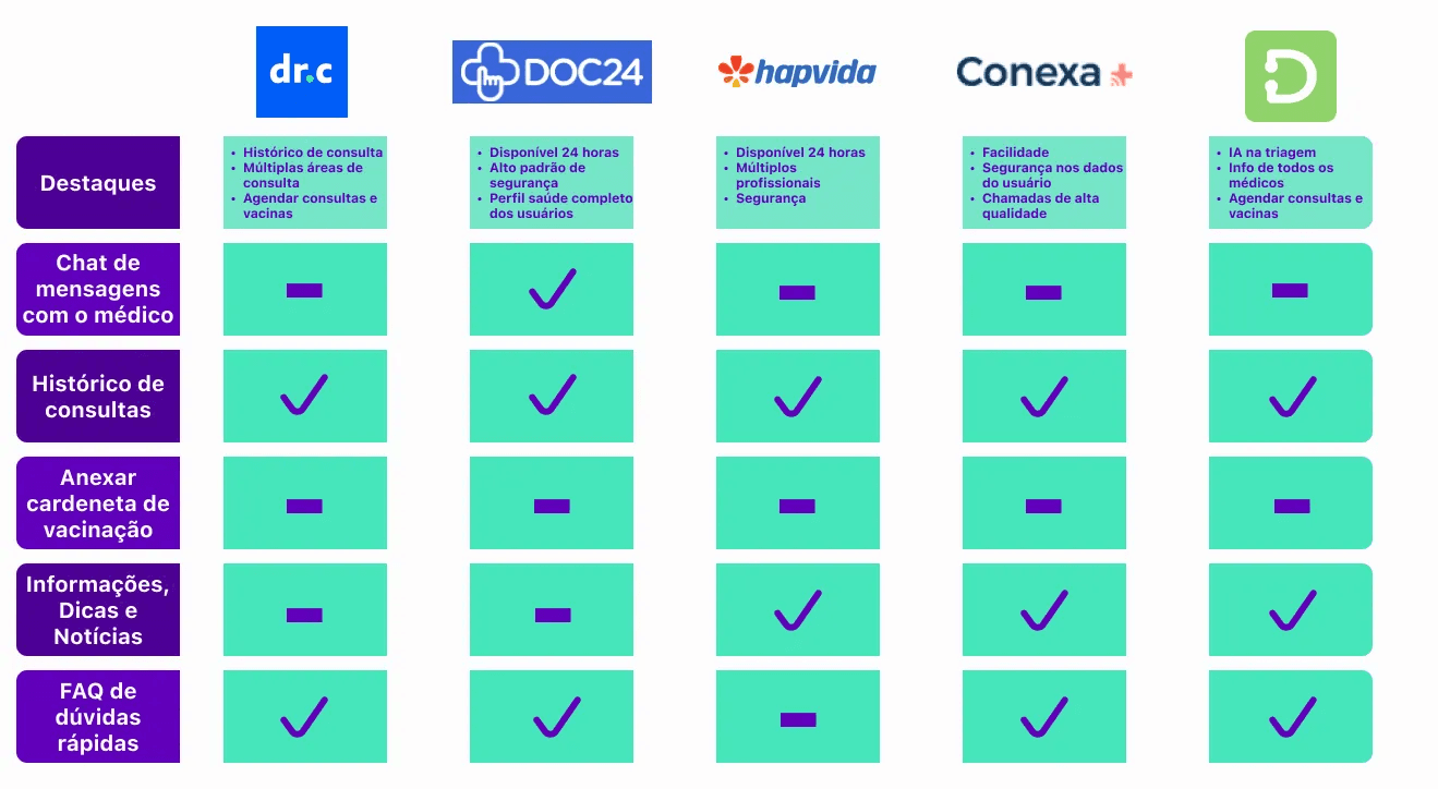 Realizei um Benchmarking/Análise de concorrentes para observar o cenário atual dos aplicativos de teleconsulta já existentes no mercado brasileiro, o que me ajudou a entender melhor em quais pontos as funcionalidades podem ser adotadas como um diferencial.