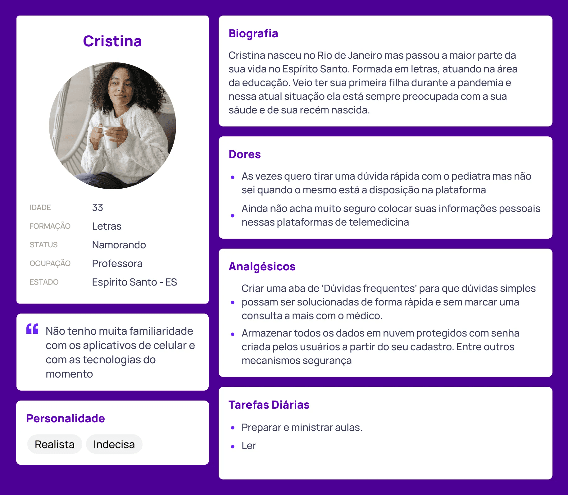 Identificado o usuário-alvo do produto, foi criada a persona de uma mãe para dar continuidade ao processo de pesquisa e manter o foco durante etapas como as do teste de usabilidade.