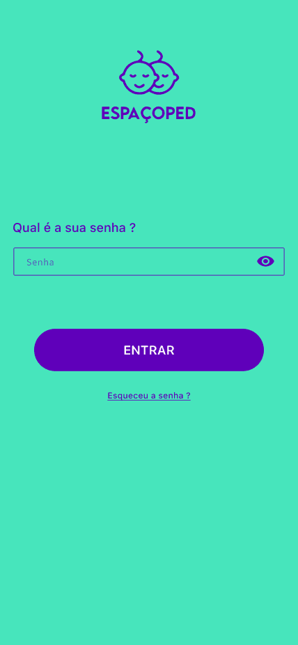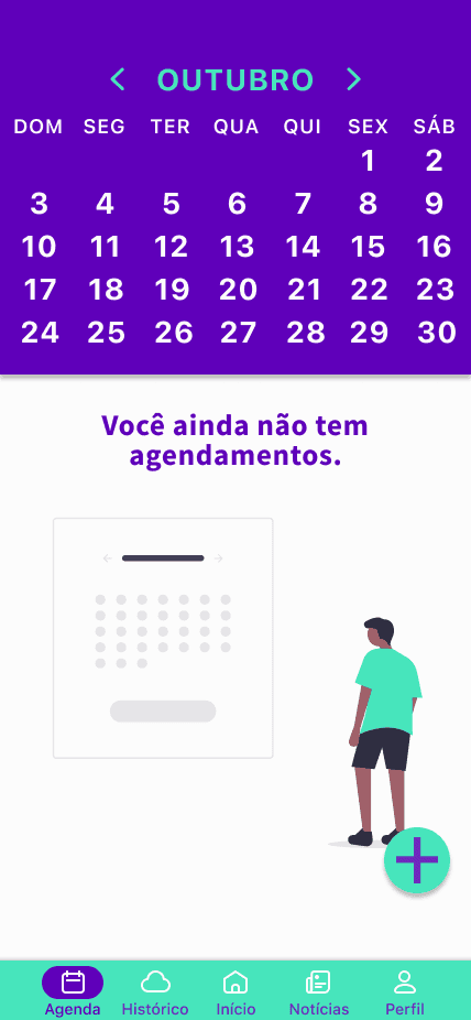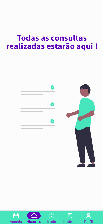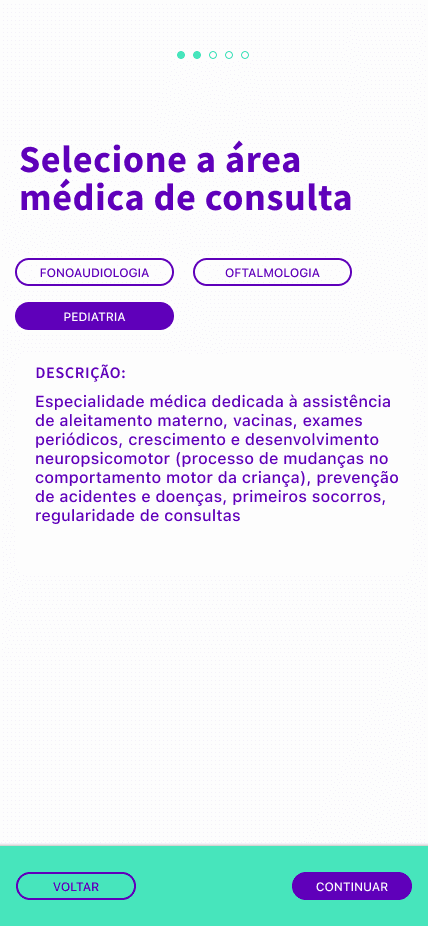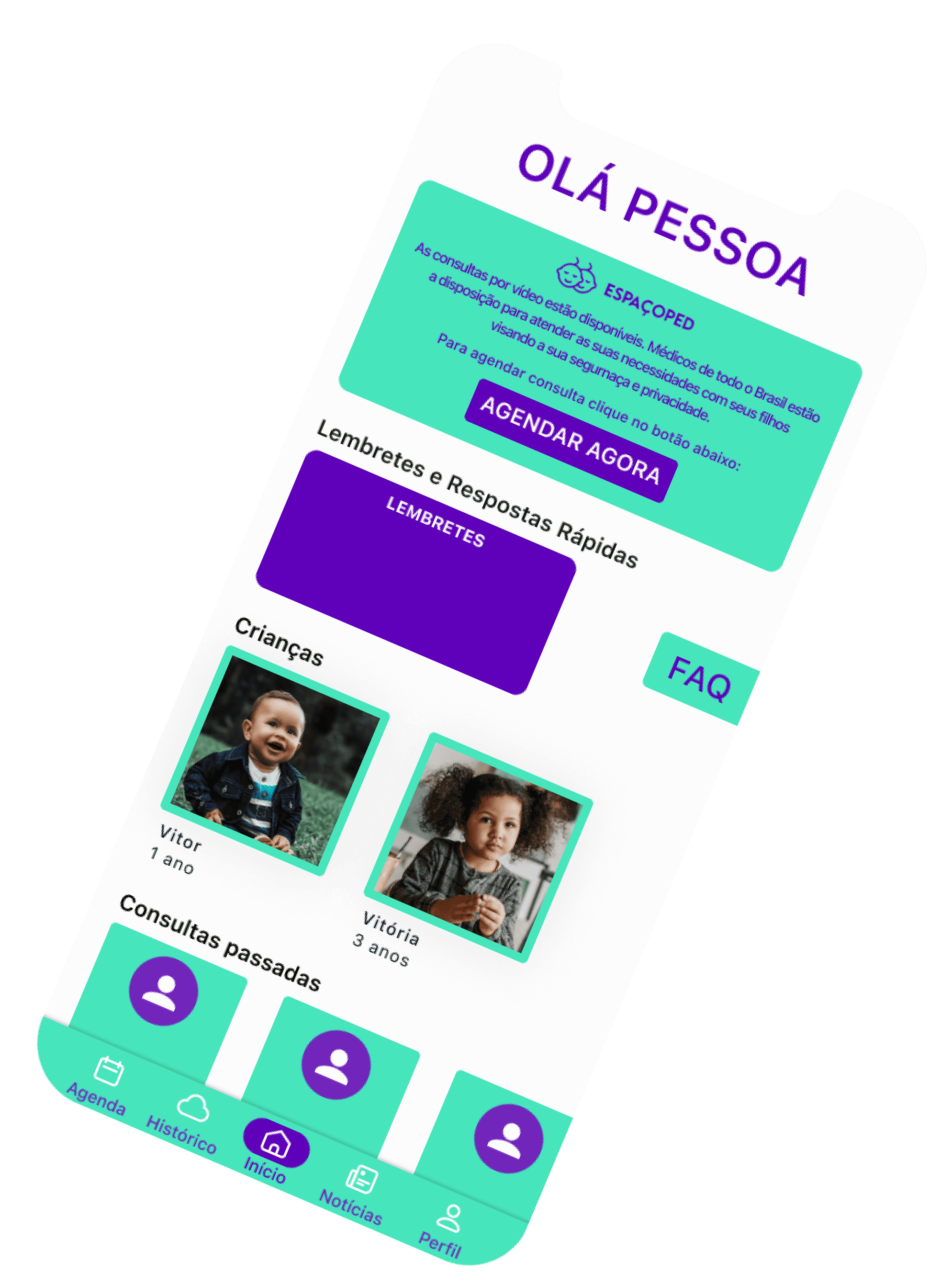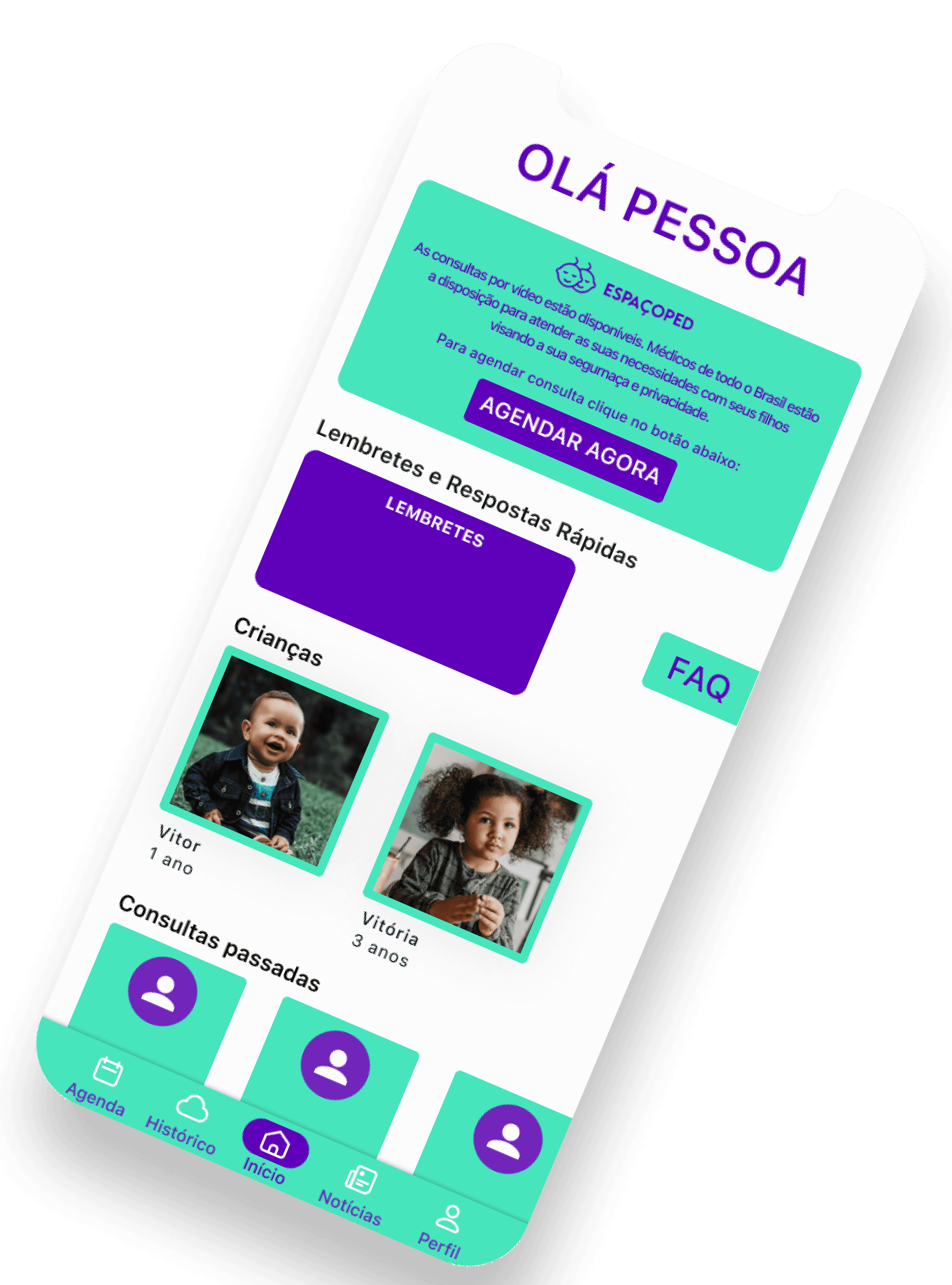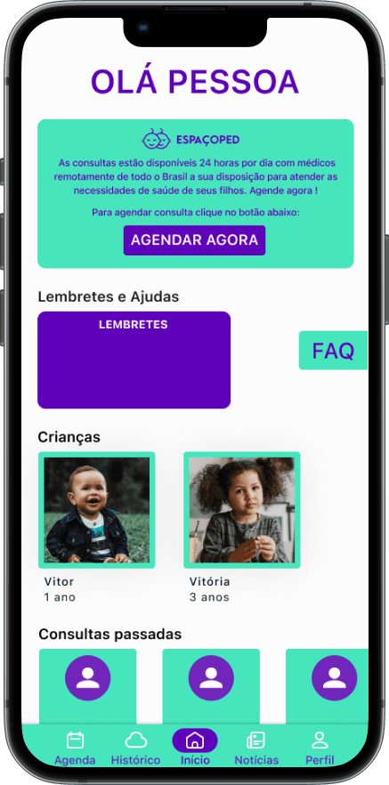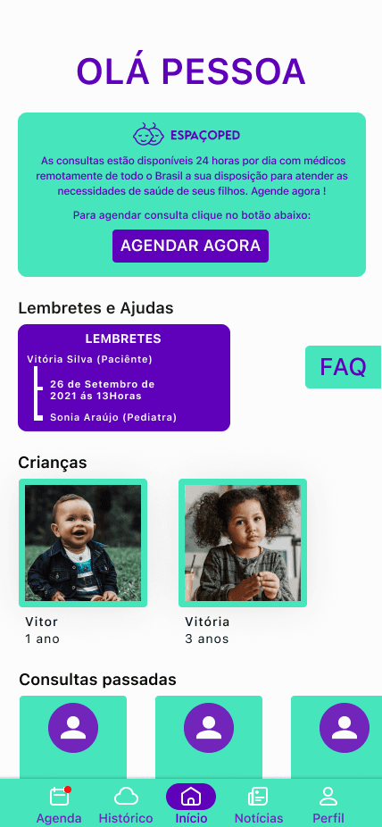 A home foi projetada com a ideia de ter tudo ao alcance do usuário. Logo de cara a tela inicial já oferece o botão de agendar consulta, área de lembretes, crianças cadastradas em sua conta, consultas anteriores e FAQ médico.